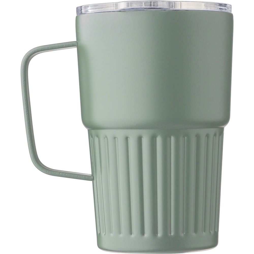 Újrahasznosított rozsdamentes acélból készült, duplafalú ivópohár (450 ml), belső része 304-es, külső része 201-es rozsdamentes acél, bordázott fogófelülettel és masszív fogantyúval. AS fedéllel rendelkezik csúsztatható zárással. A pohártesten gravírozott recycled (újrahasznosított) alapanyagra utaló logó található. Darabonként barna kartondobozba csomagolva.