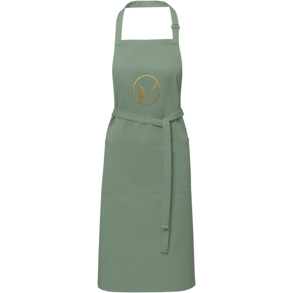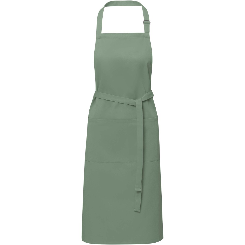 Vastag és masszív anyag, ugyanakkor puha és kényelmes viselet. A két elülső zseb gyors és egyszerű módot kínál a konyhai eszközök tárolására. A kötény nyakában csattal állítható, hátul megköthető. Nagyméretű nyomtatási lehetőség a logók megjelenítéséhez. Pamut twill 65% poliészterből és 35% pamutból, 240 g/m2.