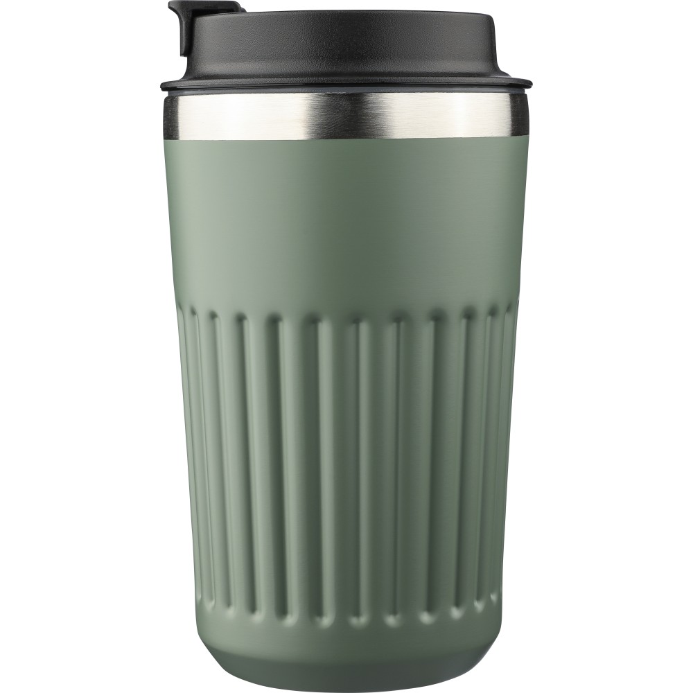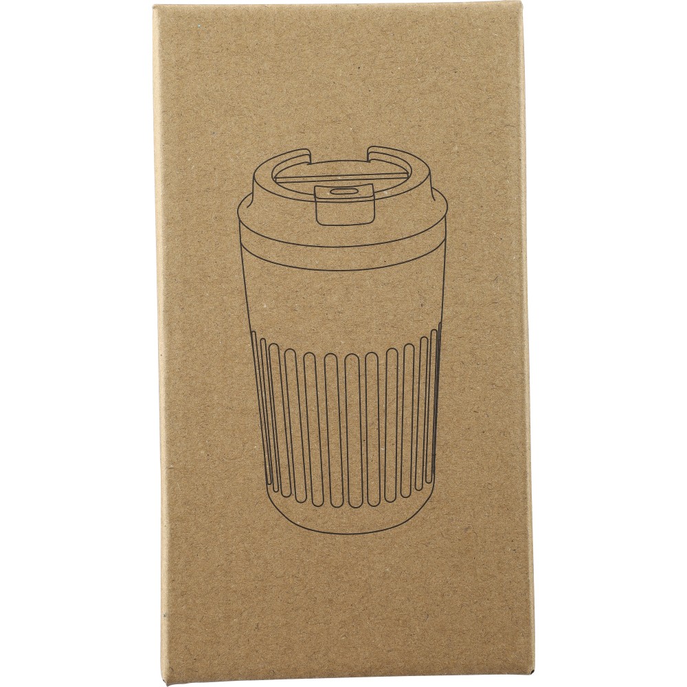 Újrahasznosított rozsdamentes acélból készült utazópohár 400 ml űrtartalommal, duplafalú kialakítással és külső bordázott felülettel. Belső része 304-es, külső része 201-es rozsdamentes acél, PP fedéllel. A pohártesten gravírozott recycled (újrahasznosított) alapanyagra utaló logó található. Darabonként barna kartondobozba csomagolva.