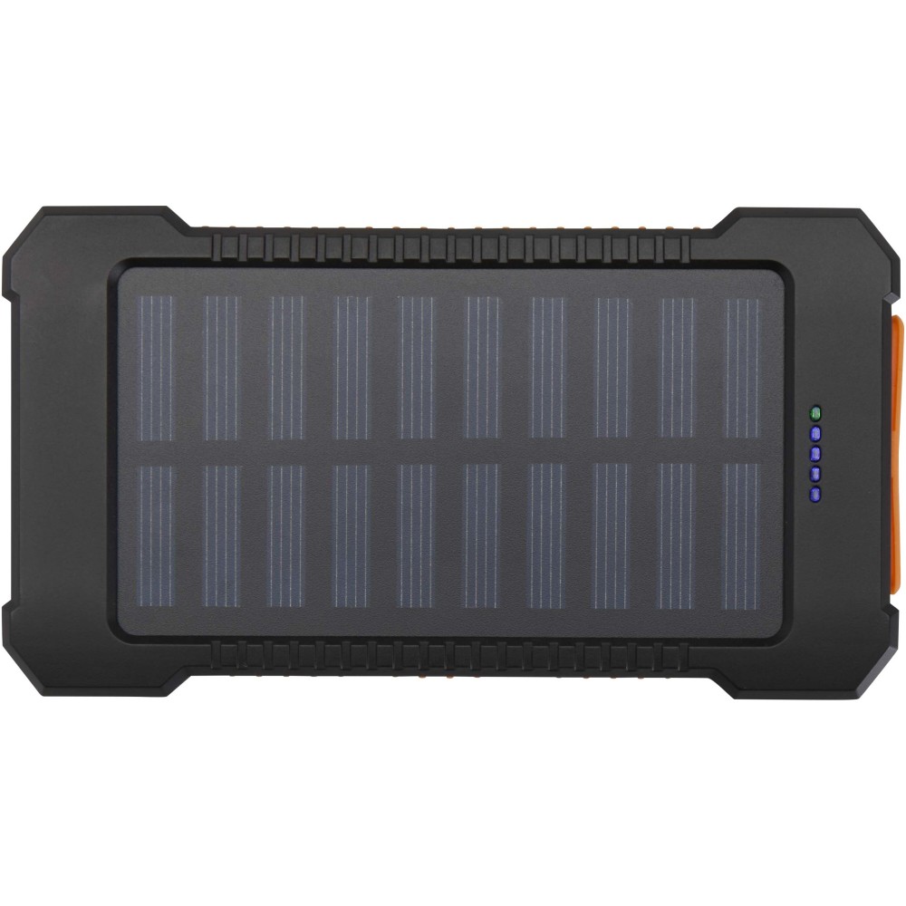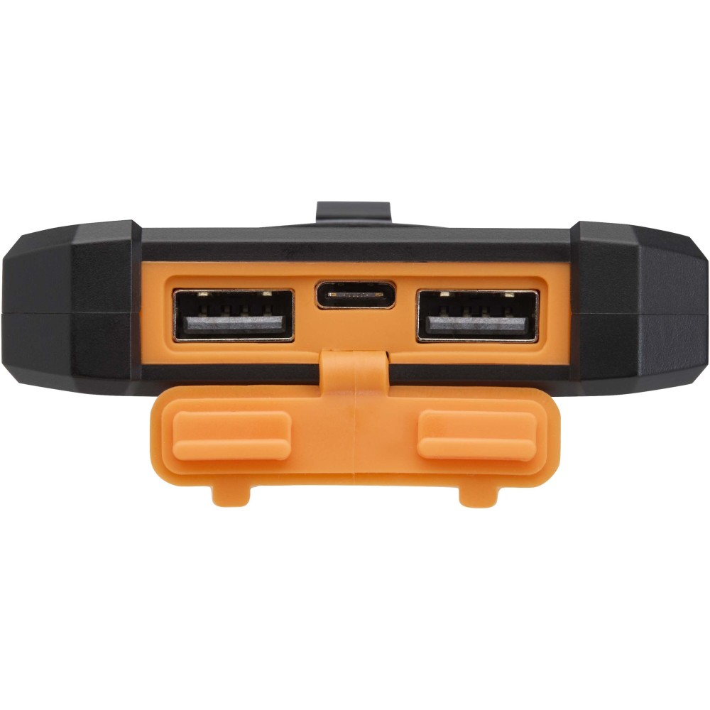 Az Altair 5000 mAh-s napelemes powerbank újrahasznosított műanyagból készül, tartósságra és kényelmes használatra tervezve. Két USB-A kimeneti porttal és egy Type-C bemenet/kimenettel rendelkezik, így rugalmas töltési lehetőségeket kínál. Masszív külső borítása és levehető csíptetője megkönnyíti a rögzítést, beépített zseblámpája pedig praktikus kiegészítő. A csatlakozók szilikon fedél mögött biztonságosan elhelyezve találhatók, a napelemes töltés funkció és az állapotjelző LED pedig ideálissá teszi szabadtéri kalandokhoz és utazásokhoz.